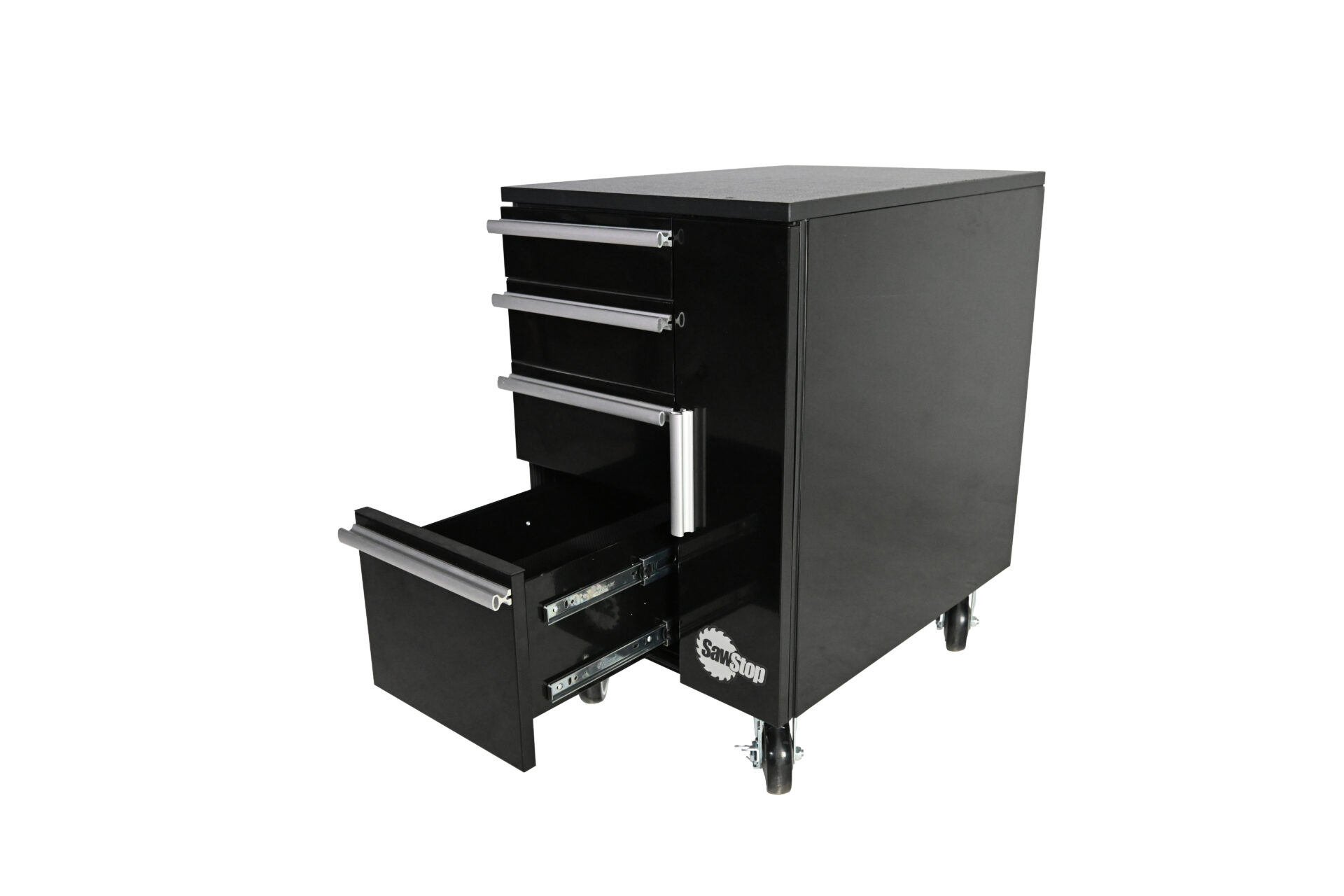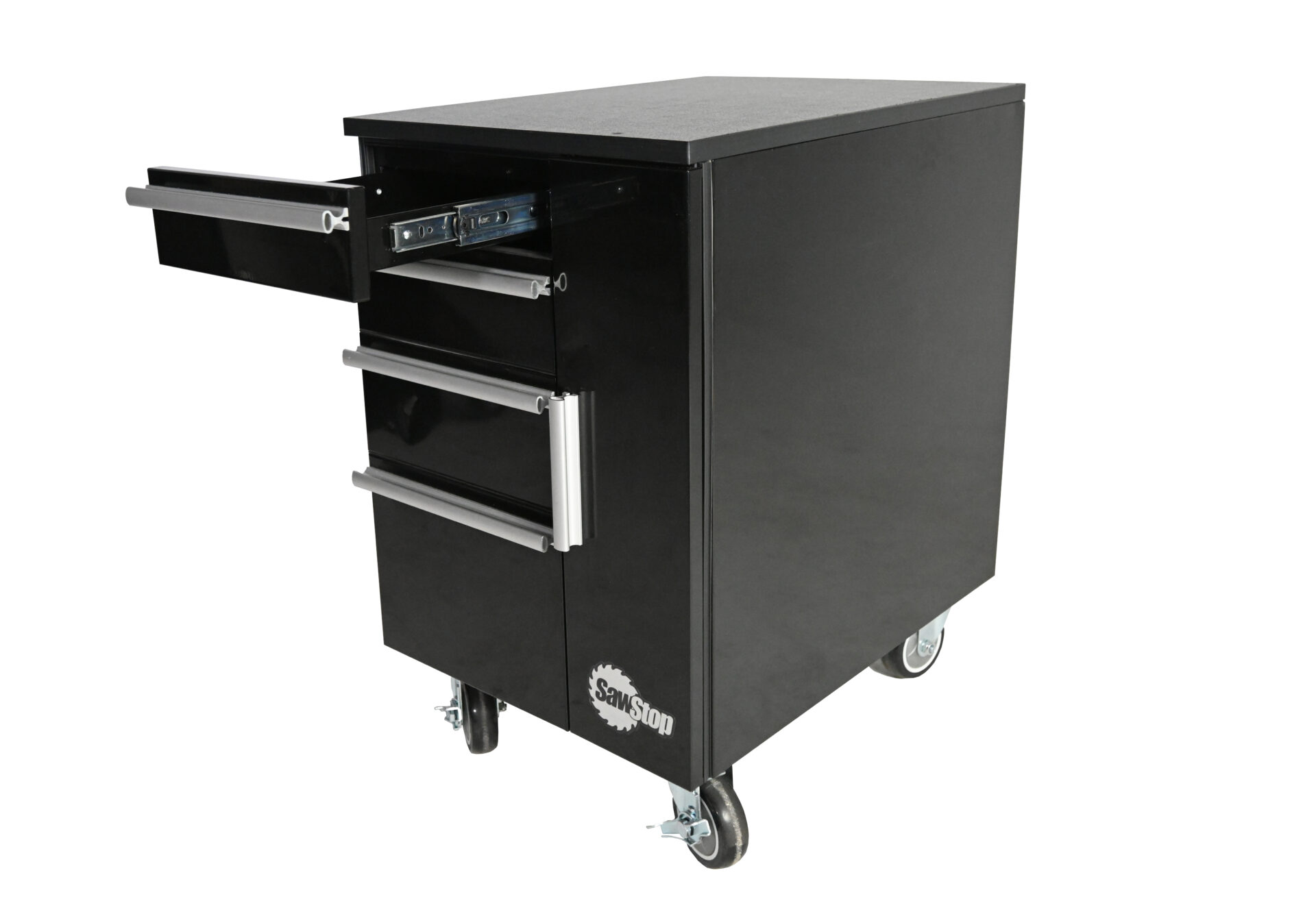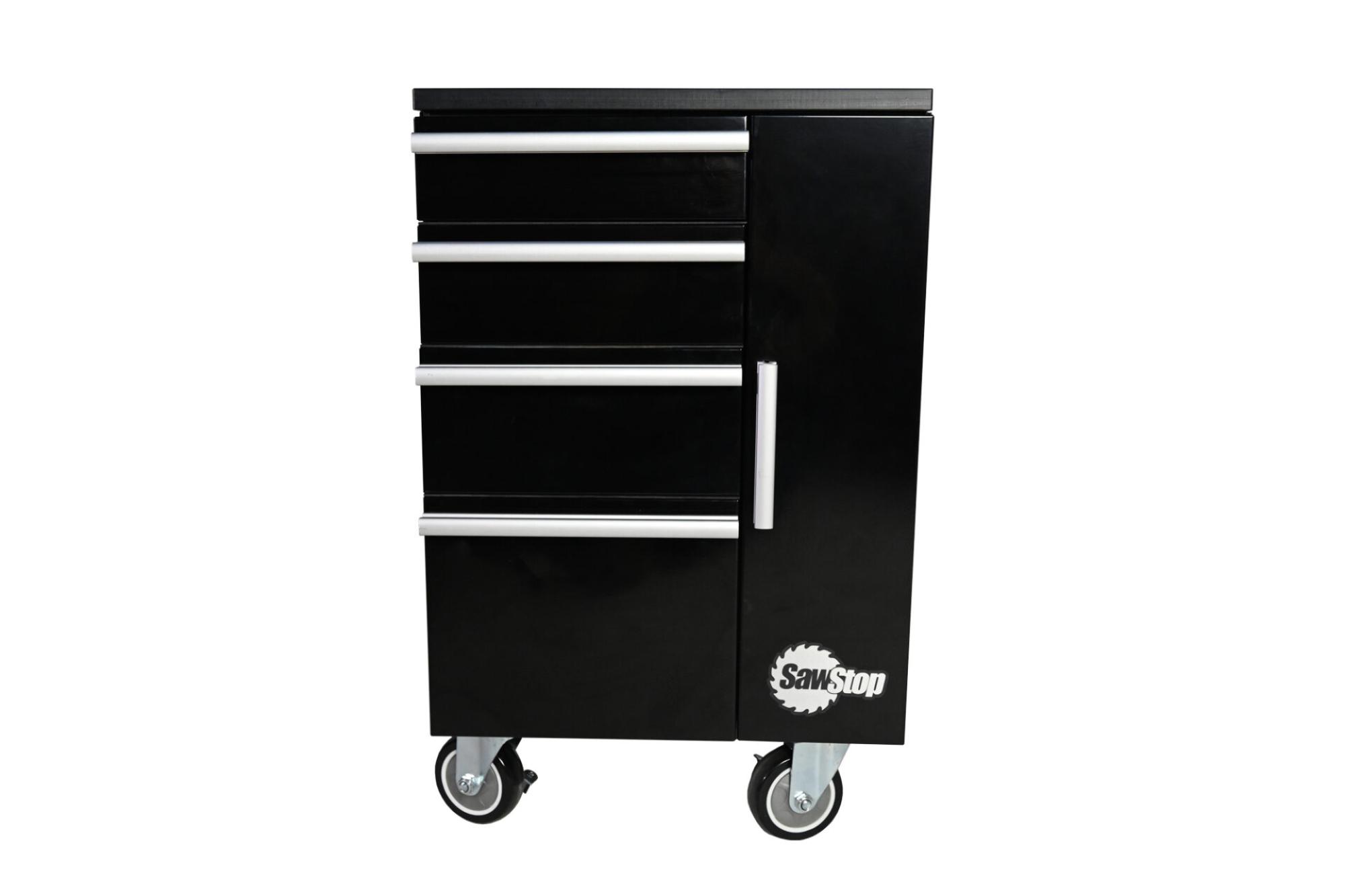 TSA-UTC18Complete your workshop with a SawStop Under Table Cabinet (UTC) designed to fit perfectly beneath your SawStop cast-iron table saw. The 18” width fits a variety of SawStop table saw configurations*. Five drawers mounted on heavy-duty, 3/4-extension soft-close drawer slides allow you to store blades, wrenches, and accessories, such as a miter gauge, push sticks, insert plates, riving knife, feather boards, measuring tapes and rules, and SawStop brake cartridges. Pull the welded-steel cabinet from beneath the saw to use the durable UHMW top as a work surface.
